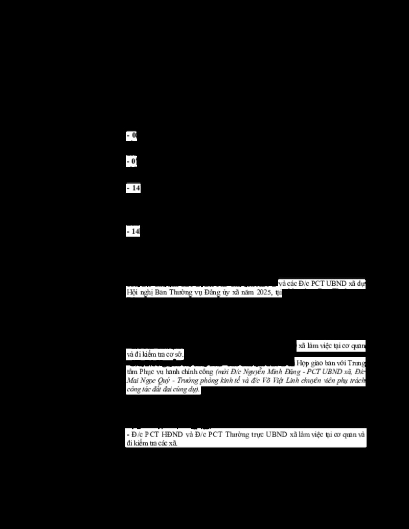 Lịch làm việc của Thường trực HĐND xã và Lãnh đạo UBND xã tuần 52 21/12/2025, 11:32:38 - Lượt xem: 17 Tweet Thêm vào danh sách Báo xấu Thông tin tài liệu Lịch làm việc của Thường trực HĐND xã và Lãnh đạo UBND xã tuần 52