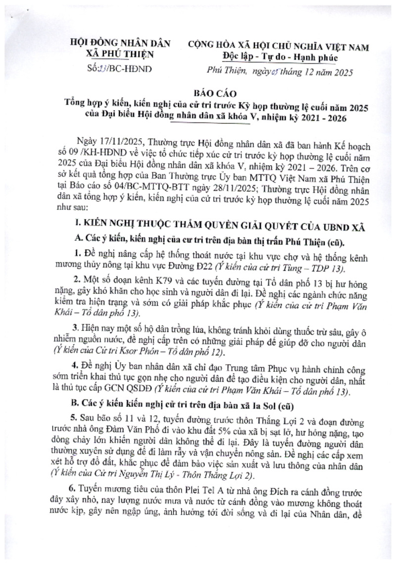 Báo cáo số 23/BC-HĐND ngày 05/12/2025 của HĐND xã về Tổng hợp ý kiến, kiến nghị của cử tri trước Kỳ họp thường lệ cuối năm 2025 của Đại biểu Hội đồng nhân dân xã khóa V, nhiệm kỳ 2021 - 2026