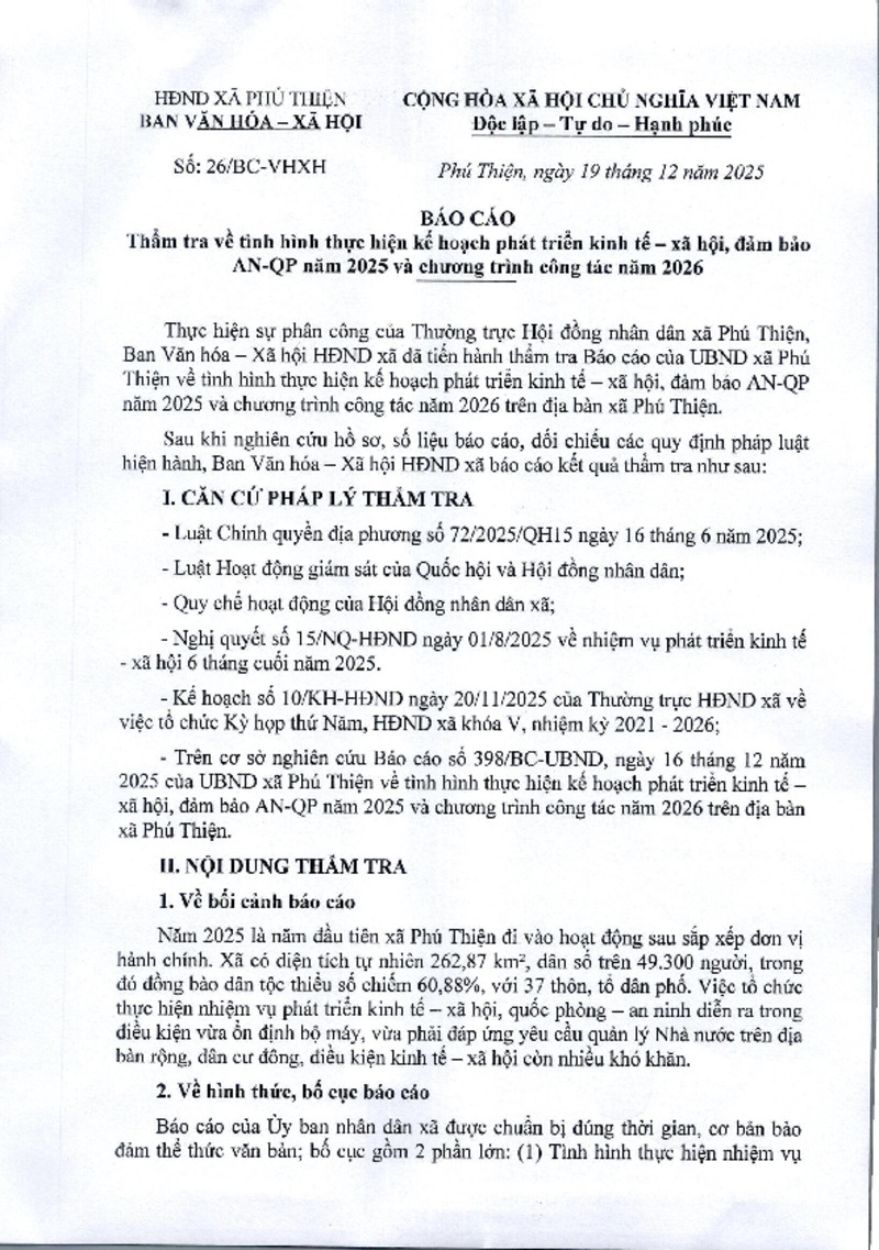 Báo cáo số 26/BC-VHXH ngày 19/12/2025 của Ban Văn hóa - Xã hội về việc Thẩm tra về tình hình thực hiện kế hoạch phát triển kinh tế – xã hội, đảm bảo AN-QP năm 2025 và chương trình công tác năm 2026