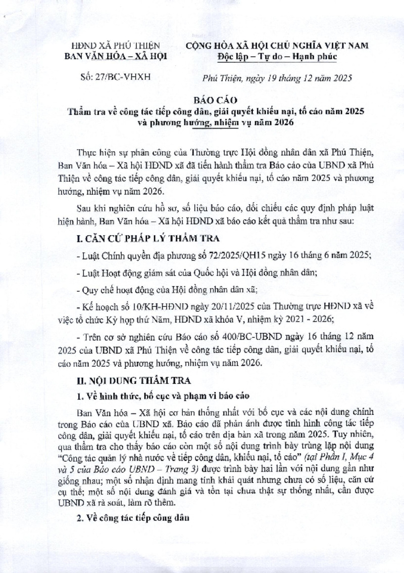 Báo cáo số 27/BC-VHXH ngày 19/12/2025 của Ban Văn hóa - Xã hội về việc Thẩm tra về công tác tiếp công dân, giải quyết khiếu nại, tố cáo năm 2025 và phương hướng, nhiệm vụ năm 2026