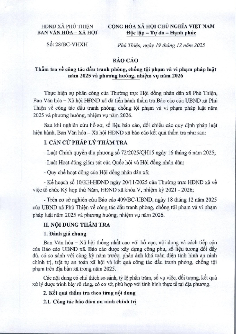 Báo cáo số 28/BC-VHXH ngày 19/12/2025 của Ban Văn hóa - Xã hội về việc Thẩm tra về công tác đấu tranh phòng, chống tội phạm và vi phạm pháp luật năm 2025 và phương hướng, nhiệm vụ năm 2026