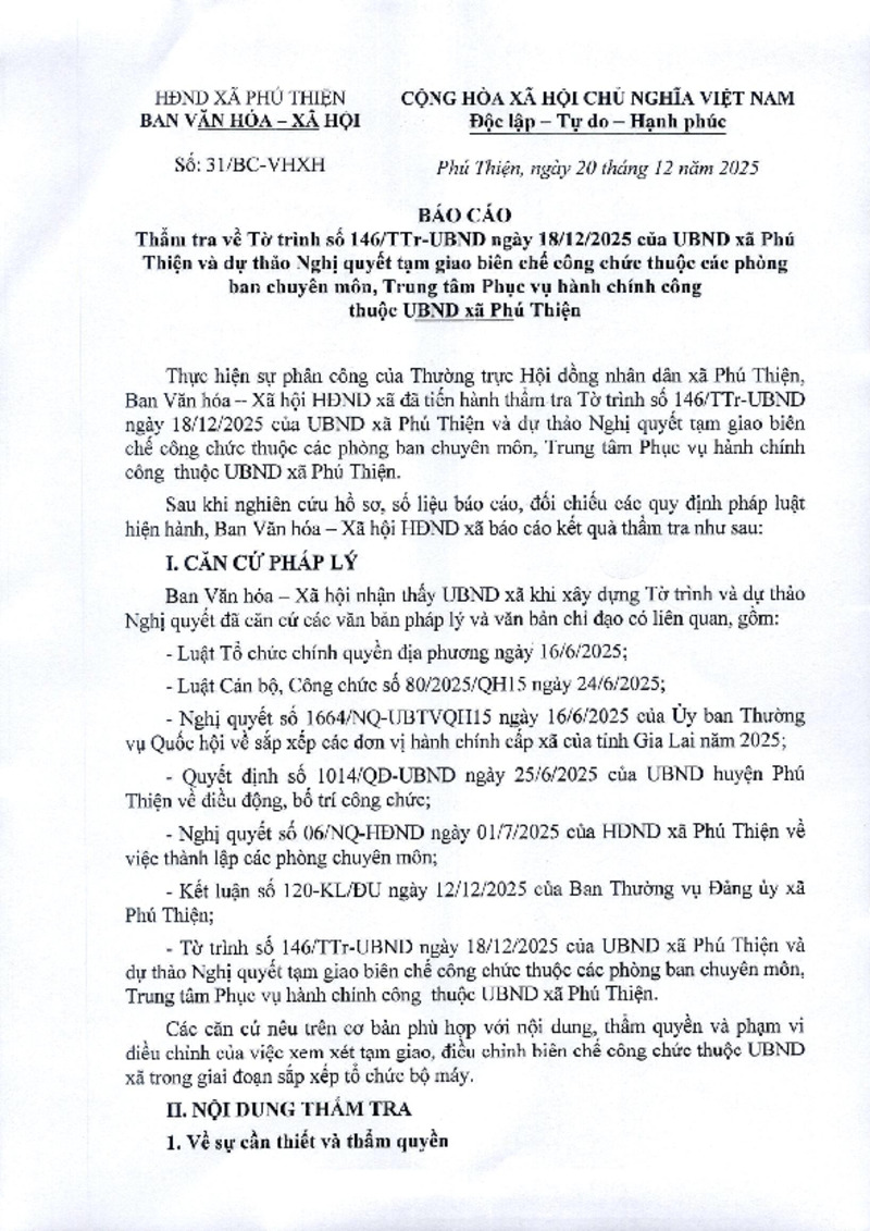 Báo cáo số 31/BC-VHXH ngày 20/12/2025 của Ban Văn hóa - Xã hội về việc Thẩm tra về Tờ trình số 146/TTr-UBND ngày 18/12/2025 của UBND xã Phú Thiện và dự thảo Nghị quyết tạm giao biên chế công chức thuộc các phòng ban chuyên môn, Trung tâm Phục vụ hành công