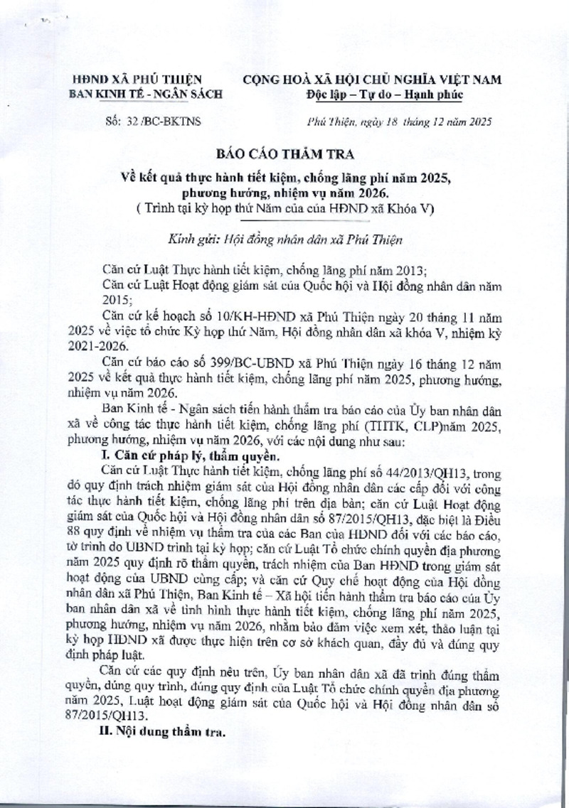 Báo cáo số 32/BC-BKTNS ngày 18/12/2025 của Ban Kinh tế ngân sách về kết quả thực hành tiết kiệm, chống lãng phí năm 2025, phương hướng, nhiệm vụ năm 2026.