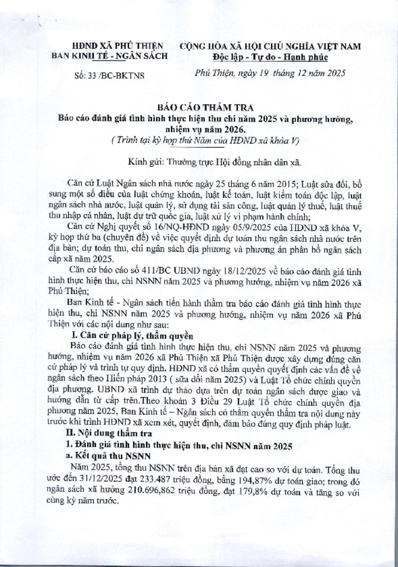 Báo cáo số 33/BC-BKTNS ngày 19/12/2025 của Ban Kinh tế ngân sách về Báo cáo đánh giá tình hình thực hiện thu chi năm 2025 và phương hướng, nhiệm vụ năm 2026.