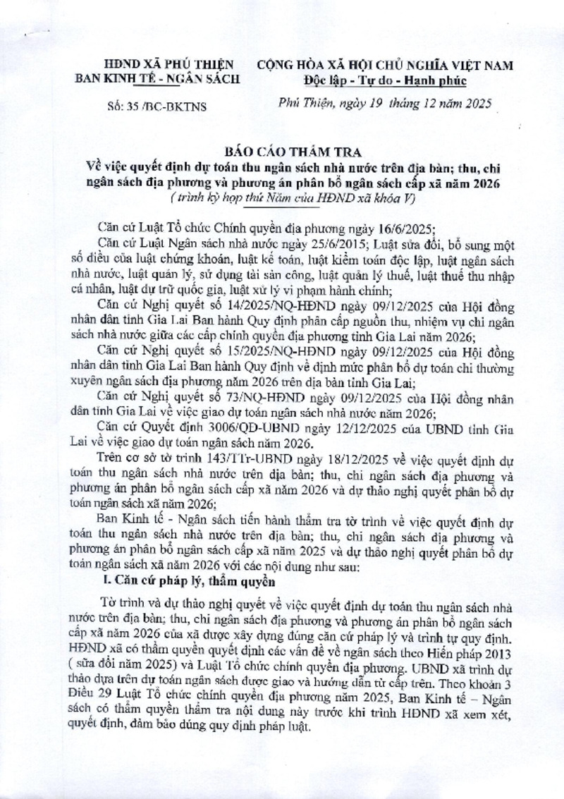Báo cáo số 35/BC-BKTNS ngày 19/12/2025 của Ban Kinh tế ngân sách về quyết định dự toán thu ngân sách nhà nước trên địa bàn; thu, chi ngân sách địa phương và phương án phân bổ ngân sách cấp xã năm 2026