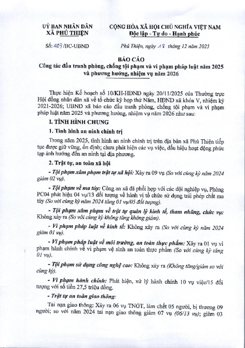 Báo cáo số 409/BC-UBND ngày 16/12/2025 của UBND xã về Công tác đấu tranh phòng, chống tội phạm và vi phạm pháp luật năm 2025 và phương hướng, nhiệm vụ năm 2026