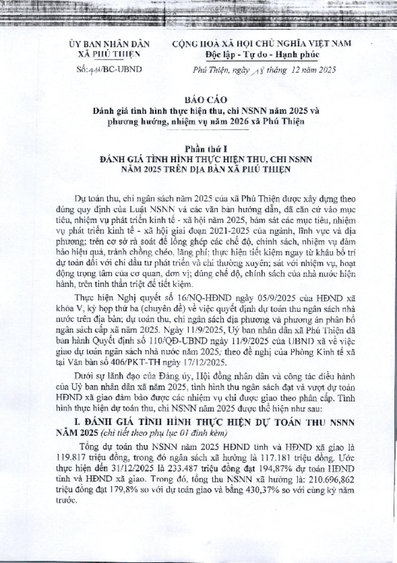 Báo cáo số 411/BC-UBND ngày 18/12/2025 của UBND xã về Báo cáo đánh giá tình hình thực hiện thu, chi NSNN năm 2025 và phương hướng, nhiệm vụ năm 2026 25/12/2025, 14:41:30 - Lượt xem: 1 Tweet Thêm vào danh sách Báo xấu Thông tin tài liệu Báo cáo số 411/BC-UBND ngày 18/12/2025 của UBND xã về Báo cáo đánh giá tình hình thực hiện thu, chi NSNN năm 2025 và phương hướng, nhiệm vụ năm 2026