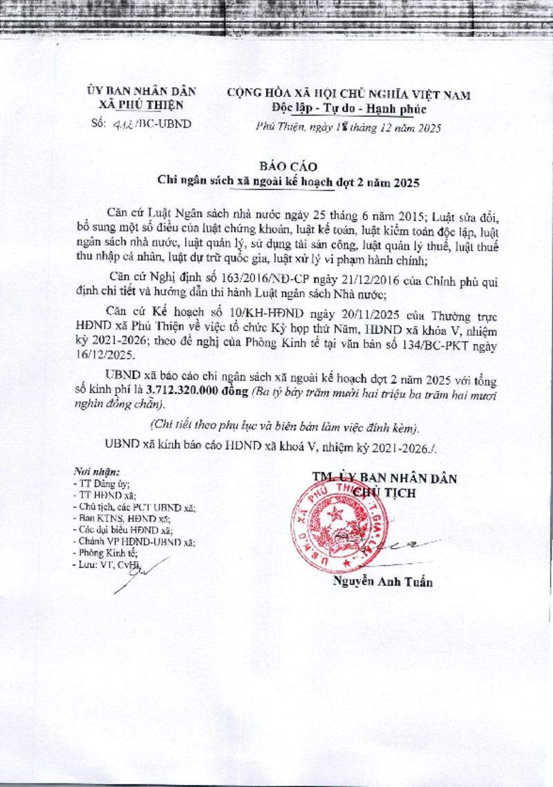 Báo cáo số 412/BC-UBND ngày 18/12/2025 của UBND xã về Chi ngân sách xã ngoài kế hoạch đợt 2 năm 2025 25/12/2025, 14:42:30 - Lượt xem: 2 Tweet Thêm vào danh sách Báo xấu Thông tin tài liệu Báo cáo số 412/BC-UBND ngày 18/12/2025 của UBND xã về Chi ngân sách xã ngoài kế hoạch đợt 2 năm 2025