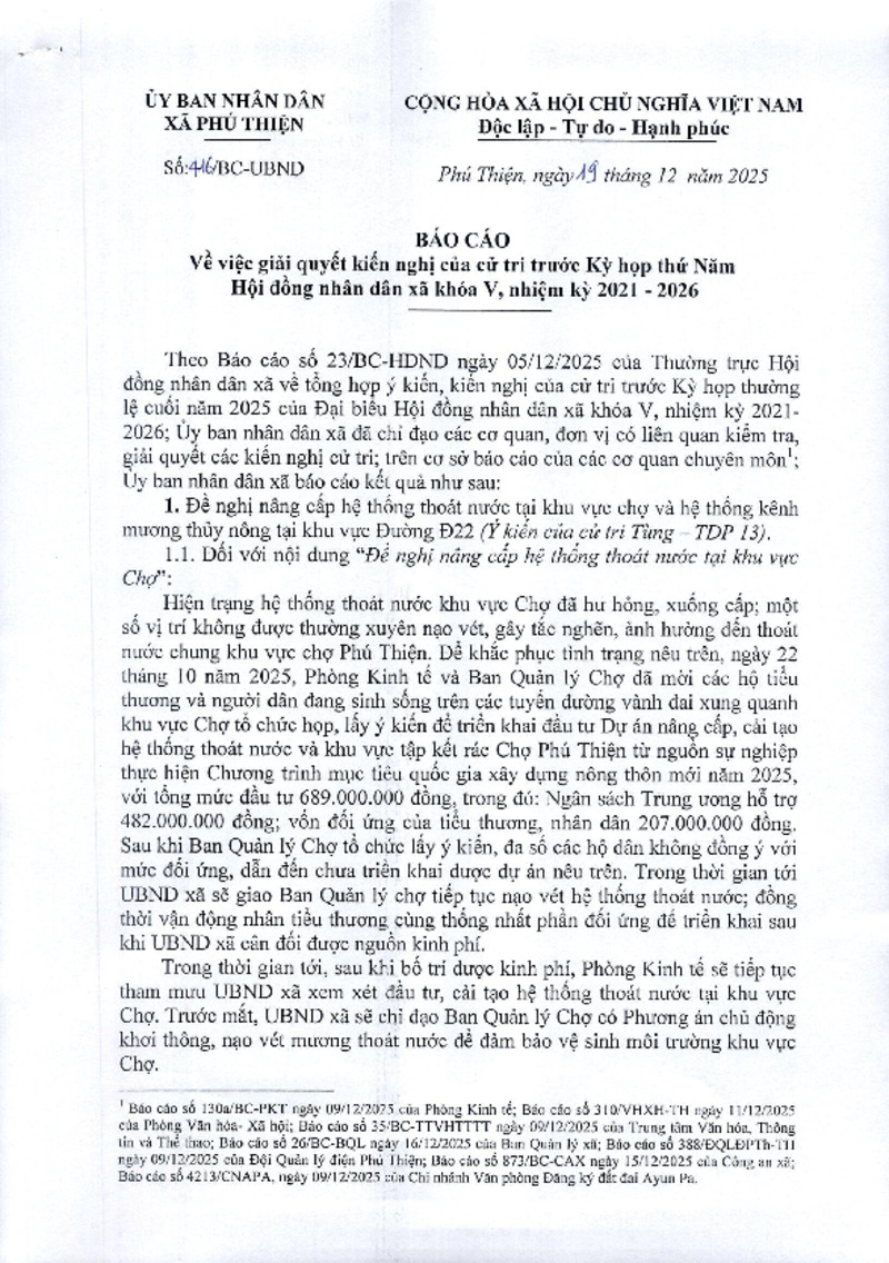 Báo cáo số 416/BC-UBND ngày 19/12/2025 của UBND xã về việc giải quyết kiến nghị của cử tri trước Kỳ họp thứ Năm Hội đồng nhân dân xã khóa V, nhiệm kỳ 2021 - 2026