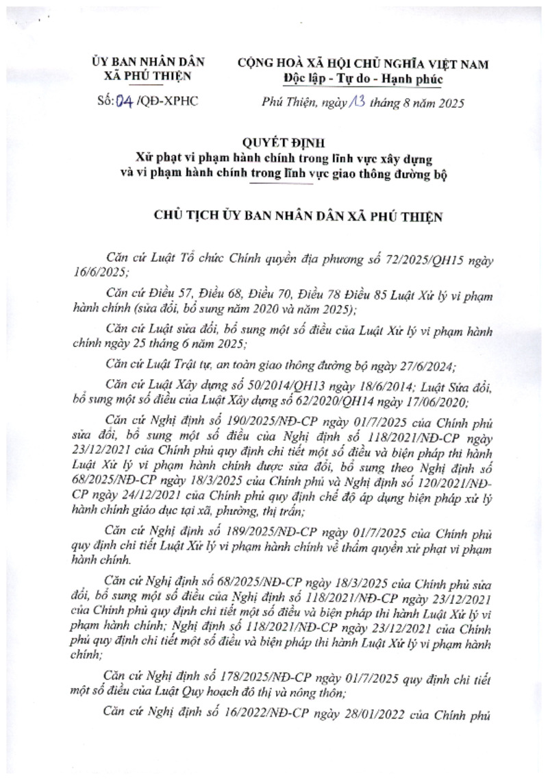 Quyết định Xử phạt vi phạm hành chính trong lĩnh vực xây dựng và vi phạm hành chính trong lĩnh vực giao thông đường bộ đối với ông Phạm Văn Hợp, 13/08/2025, 08:37:51 - Lượt xem: 5 Tweet Thêm vào danh sách Báo xấu Thông tin tài liệu Quyết định Xử phạt vi phạm hành chính trong lĩnh vực xây dựng và vi phạm hành chính trong lĩnh vực giao thông đường bộ đối với ông Phạm Văn Hợp,