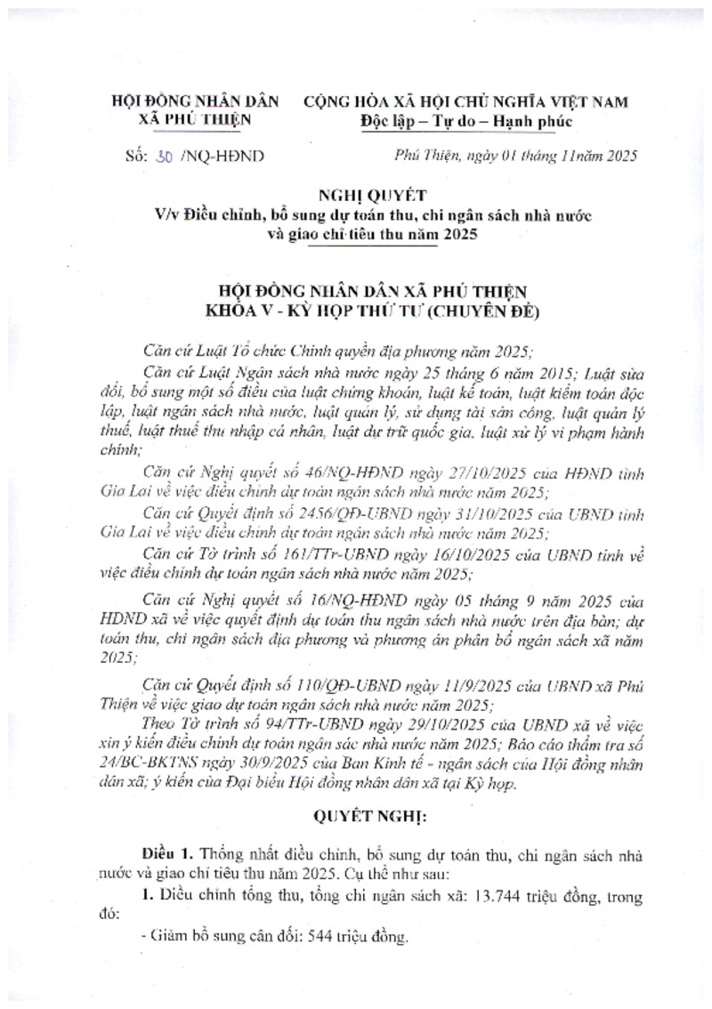 Nghị quyết số 30/NQ-HĐND ngày 01/11/2025 của HĐND xã về việc Điều chỉnh, bổ sung dự toán thu, chi ngân sách nhà nước và giao chỉ tiêu thu năm 2025 06/12/2025, 20:34:59 - Lượt xem: 0 Tweet Thêm vào danh sách Báo xấu Thông tin tài liệu Nghị quyết số 30/NQ-HĐND ngày 01/11/2025 của HĐND xã về việc Điều chỉnh, bổ sung dự toán thu, chi ngân sách nhà nước và giao chỉ tiêu thu năm 2025