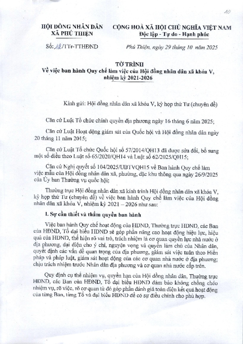 Tờ trình số 12/TTr-HĐND ngày 29/10/2025 của HĐND xã Về việc ban hành Quy chế làm việc của Hội đồng nhân dân xã khóa V, nhiệm kỳ 2021-2026 31/10/2025, 16:52:49 - Lượt xem: 3 Tweet Thêm vào danh sách Báo xấu Thông tin tài liệu Tờ trình số 12/TTr-HĐND ngày 29/10/2025 của HĐND xã Về việc ban hành Quy chế làm việc của Hội đồng nhân dân xã khóa V, nhiệm kỳ 2021-2026